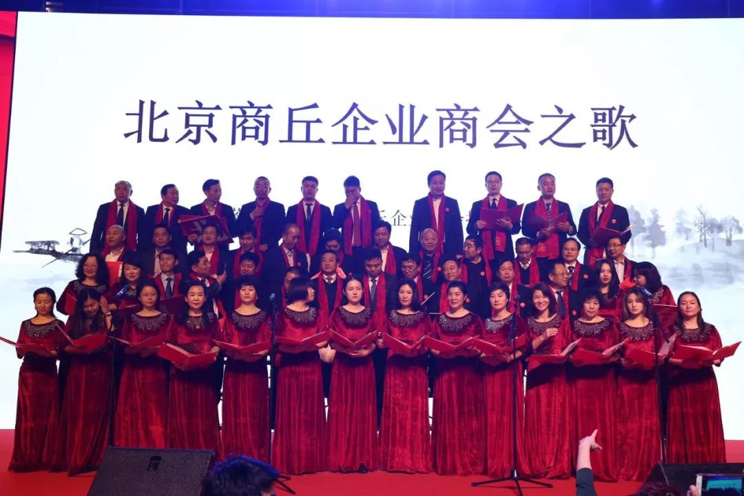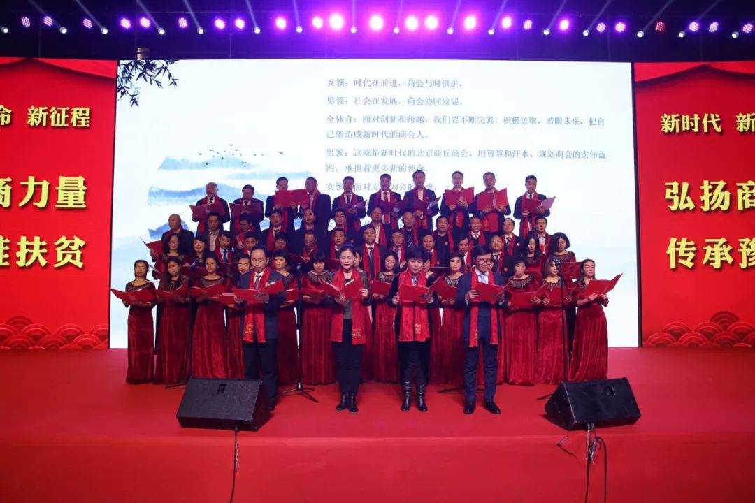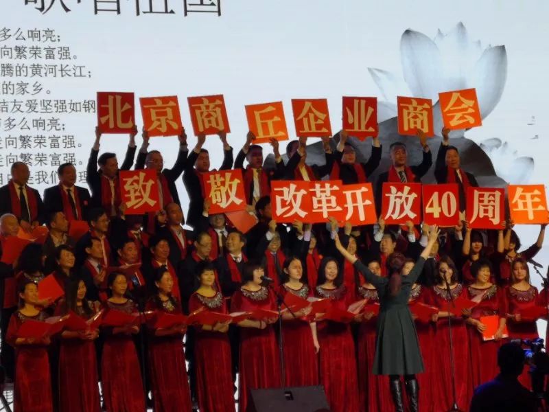 晚宴期间,文艺节目精彩纷呈。特别是由北京商丘企业商会邓天志会长率领的六十多位副会长和会员共同参加的,由执行秘书长蒋红梅创作的《北京商丘企业商会之歌》大型诗朗诵,以及大合唱《歌唱祖国》致敬改革开放40周年,气势恢宏壮观,让与会人员热情高涨,纷纷起立鼓掌,一起歌唱,将现场气氛推向高潮。