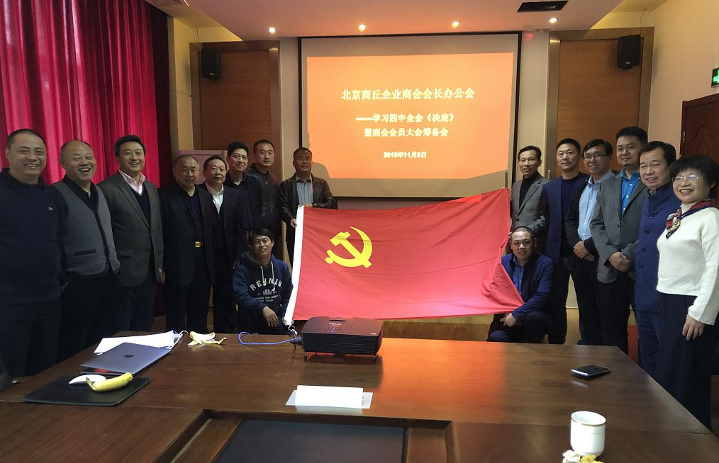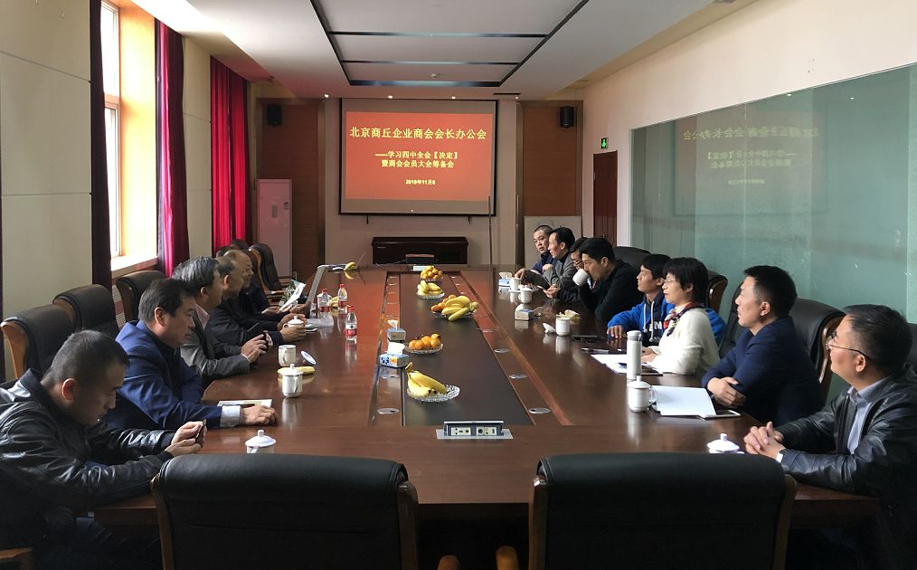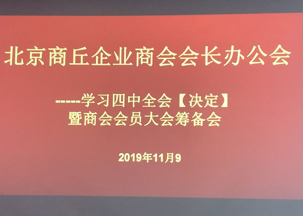 2019年11月9日,北京商丘企业商会会长办公会在常务副会长邵纪军、杨树军公司所在地石景山区老山西街19号院举行。会长邓天志,常务副会长朱勇、秘书长兼常务副会长张新成、常务副会长史本才、张东风、郭强、刁玉林、孙兴杰、杨树军,副会长王飞、卢国栋、谢建礼、马驰、王民伟、杜俊杰、徐伟峰,党员代表谢明坤,执行秘书长蒋红梅等人出席会议。会议主题为学习四中全会精神暨商会会员大会筹备会。