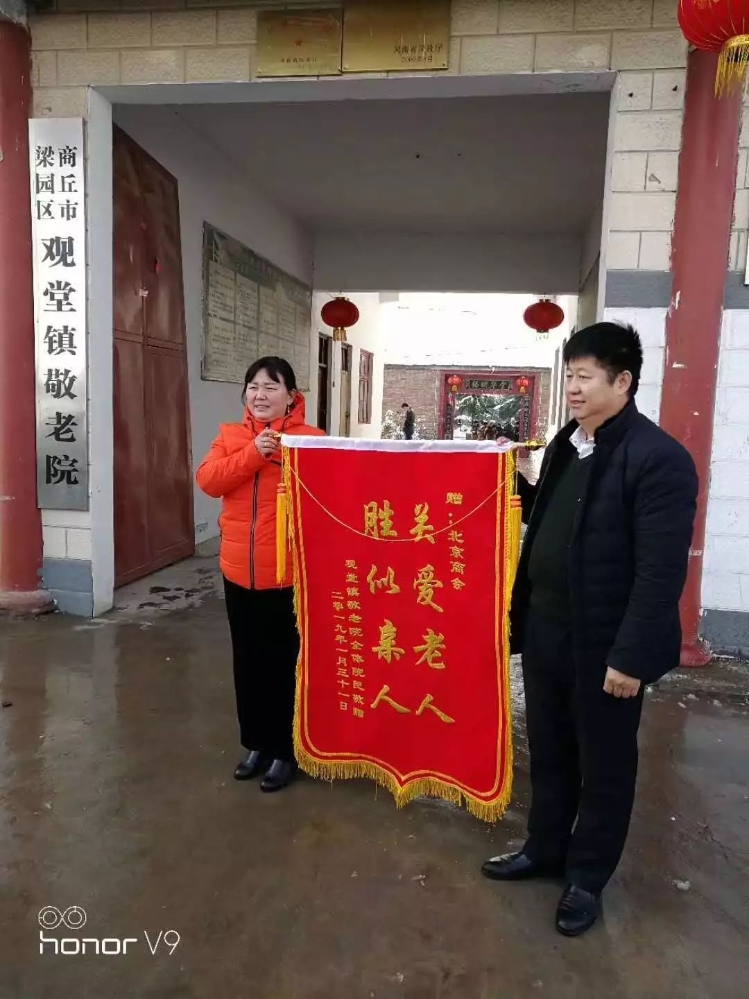 观堂镇敬老院负责人代表敬老院给北京商丘企业商会赠送了锦旗。