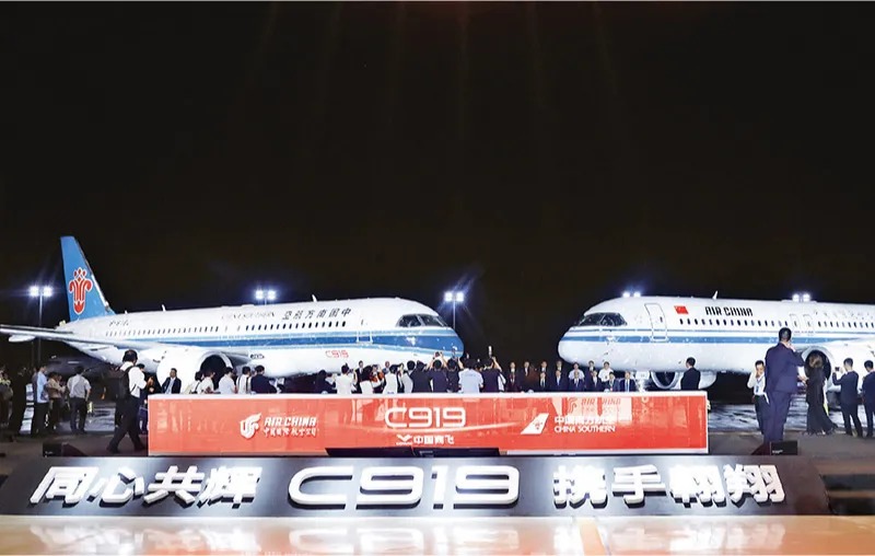 新时代以来,科技创新突破不断实现,创新驱动发展能力持续提升,标注着高质量发展的生动实践,描绘着中国式现代化的新图景。图为2024年8月28日在中国商飞总装制造中心浦东基地拍摄的国产大飞机C919交付仪式现场。新华社记者 方喆/摄